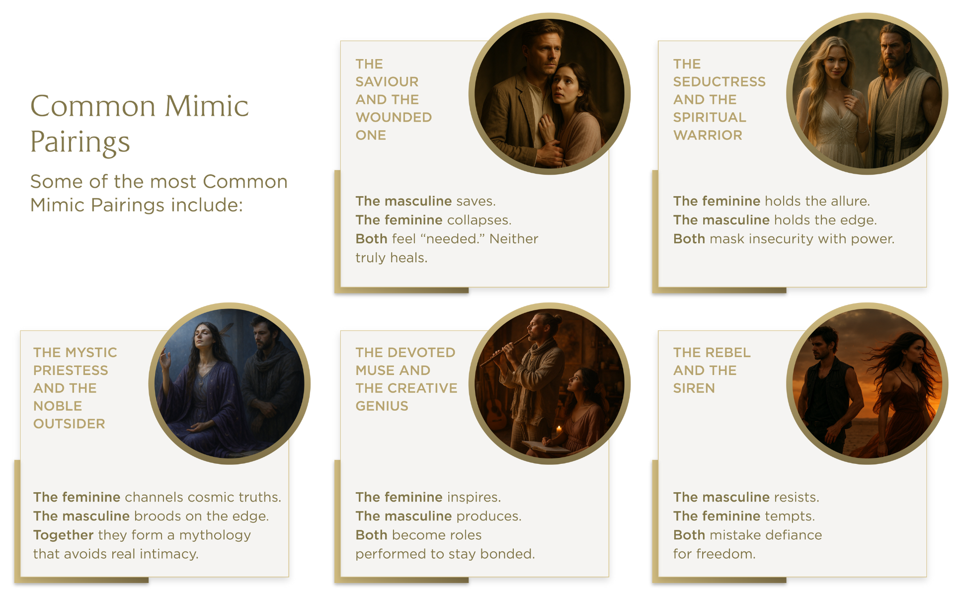Mimics are master performers. They show up through well-meaning facilitators, in ungrounded ceremonial spaces, and sometimes through your own unintegrated trauma responses. You start playing a role — the good healer, the pure channel, the spiritual leader — but you don’t feel at peace inside your own system.